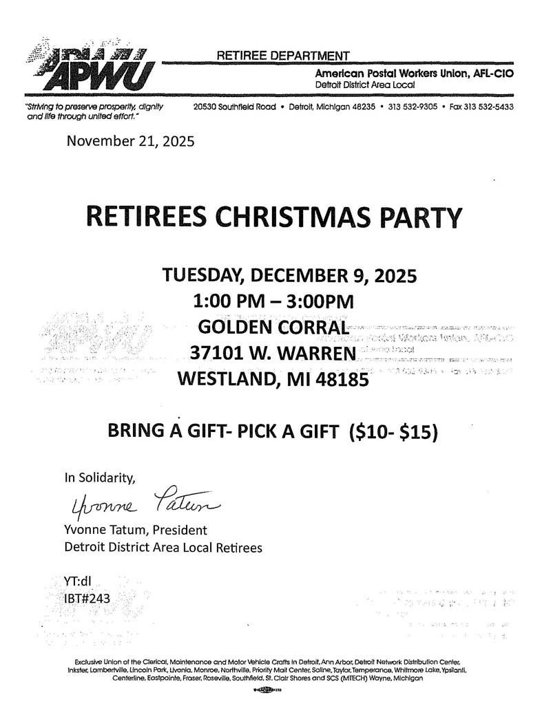 Home of the American Postal Workers Union, Detroit District Area Local #295, AFL-CIO